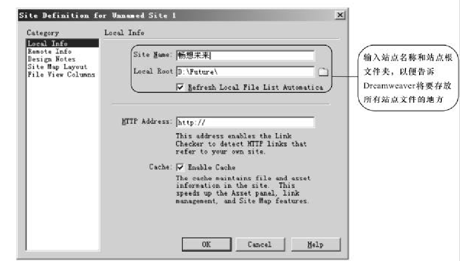 ①在“Site Name(站點(diǎn)名稱)”文本框中輸入所要定義的網(wǎng)站名稱,例如“暢想未來”。這這里的站點(diǎn)名稱只是一個(gè)標(biāo)識(shí),可以使用中文。