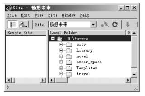 (2)在D盤的根文件夾下建立一個(gè)文件夾“Future'”,在 Future下建建立一個(gè)子文件夾city用來存放“暢想未來”網(wǎng)站中“未來都市”欄目的有關(guān)文件,然后再在city文件夾下建立下級(jí)子文件夾,如 Images、sounds及swf等。同樣地,在Future下建立其他各個(gè)文件夾(如圖所示)