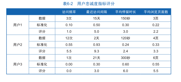 表6-2中,用戶忠誠度的4個分析指標(biāo)經(jīng)過標(biāo)準(zhǔn)化處理后統(tǒng)一以10分制的形式輸出,這樣就能直接區(qū)分每個用戶的每項指標(biāo)的表現(xiàn)好壞。基于每個指標(biāo)的評分,可以對用戶進(jìn)行篩選,比如營銷部門重點跟進(jìn)經(jīng)常訪問網(wǎng)站的用戶,可以選擇訪問頻率評分大于3分的用戶,或者重點跟進(jìn)用戶訪問參與度較高的用戶,可以篩選平均停留時間和平均訪問頁面數(shù)都大于3分的用戶,這樣能夠幫助營銷部門迅速定位忠誠用戶。