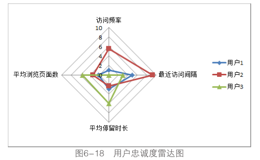 圖6-18使用了表6-2中三位用戶的評分?jǐn)?shù)據(jù)繪制而成,能夠非常形象地表現(xiàn)用戶忠誠度在各指標(biāo)上的表現(xiàn)情況,用戶1的整體忠誠度較低,用戶2在訪問頻率和訪問間隔具有較好表現(xiàn),而用戶aki訪問具有相對較高的參與度。使用雷達(dá)圖分析用戶的忠誠度主要有如下優(yōu)勢: