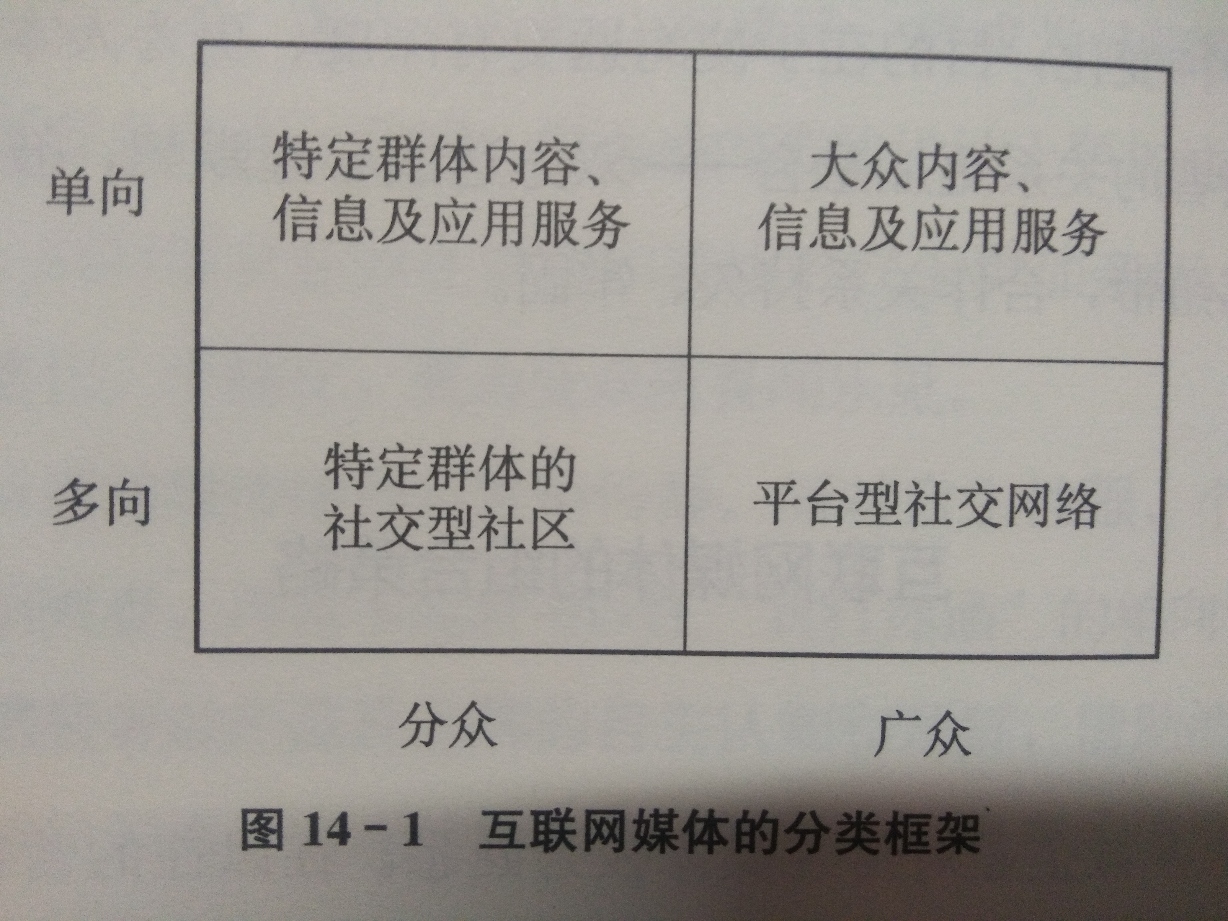 互聯(lián)網(wǎng)是一個連接眾多主體、匯集和流轉(zhuǎn)各類信息的巨大平臺。在這個空間內(nèi),媒體種類繁雜,呈離散式、分布式結(jié)構(gòu)(無中心),總的來說,互聯(lián)網(wǎng)媒體中既有搜索、社交平臺等領(lǐng)域的少數(shù)短頭,也有數(shù)量龐大、形態(tài)各異的長尾(包括各類小范圍的社會化媒體以及自媒體等),就后者而言,互聯(lián)網(wǎng)媒體具有碎片化的特征。由于互聯(lián)網(wǎng)媒體形態(tài)復雜,因此有必要對它們進行分類。在此,我們提出一個二維分類框架: 維度之一是媒體影響人群的廣度和范圍;維度之二是媒體信息通道上信息傳遞和流轉(zhuǎn)的方向,由此形成四個象限(見圖14-1)。