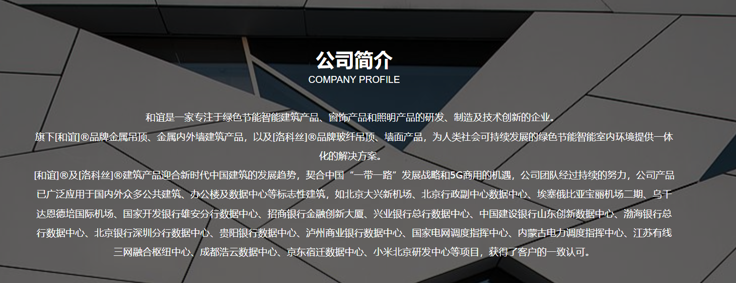 旗下[和誼]®品牌金屬吊頂、金屬內(nèi)外墻建筑產(chǎn)品,以及[洛科絲]®品牌玻纖吊頂、墻面產(chǎn)品,為人類社會可持續(xù)發(fā)展的綠色節(jié)能智能室內(nèi)環(huán)境提供一體化的解決方案。