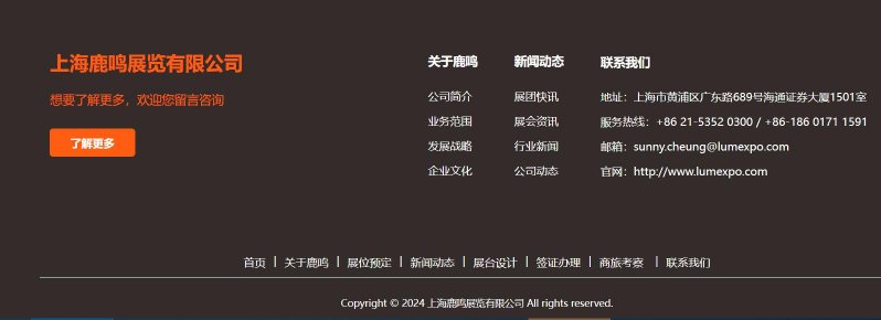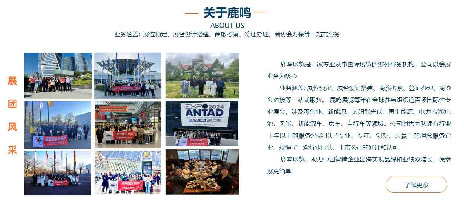 鹿鳴展覽是一家專業(yè)從事國際展覽的涉外服務(wù)機(jī)構(gòu),公司以會(huì)展業(yè)務(wù)為核心,業(yè)務(wù)涵蓋:展位預(yù)定、展臺(tái)設(shè)計(jì)搭建、商旅考察、簽證辦理、商協(xié)會(huì)對接等一站式服務(wù)。 鹿鳴展覽每年在全球參與組織近百場國際性專業(yè)展會(huì),涉及零售業(yè)、包裝、光伏太陽能、儲(chǔ)能、電池、充電樁、可再生能源等領(lǐng)域。公司銷售團(tuán)隊(duì)擁有行業(yè)十年以上的服務(wù)經(jīng)驗(yàn),以“專業(yè)、專注、負(fù)責(zé)任”的理念服務(wù)企業(yè),獲得了一眾行業(yè)巨頭、上市公司的好評和認(rèn)可。 鹿鳴展覽,專業(yè)助力企業(yè)拓展全球市場!