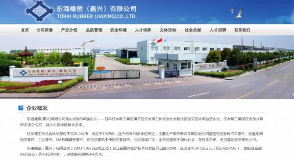 東*橡塑(嘉興)有限公司于2003年9月2日成立,位于浙江省嘉興經(jīng)濟技術(shù)開發(fā)區(qū)崗山路500號,注冊資本34.5億日元(約2.4億RMB),總投資金額69億日元(約4.8億RMB),占地面積88064平方米。公司主要生產(chǎn)和銷售汽車用減震器,擁有世界一流的高科技水平。公司的主要客戶為在中國投資生產(chǎn)的日系汽車廠家。如豐田、本田、日產(chǎn)、馬自達、鈴木、三菱等客戶。產(chǎn)品絕大部分以中國市場為主,部分產(chǎn)品遠銷日本、美國等地。