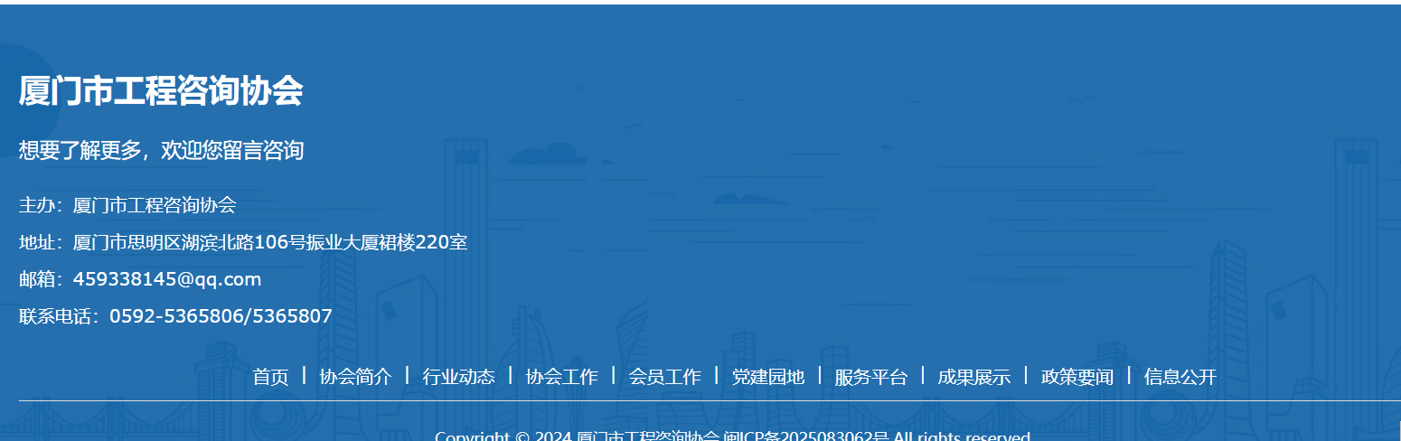 協會注冊登記機關是廈門市民政局;協會業務指導部門是廈門市發改委;協會為中國工程咨詢協會理事單位,并接受其業務指導和安排。